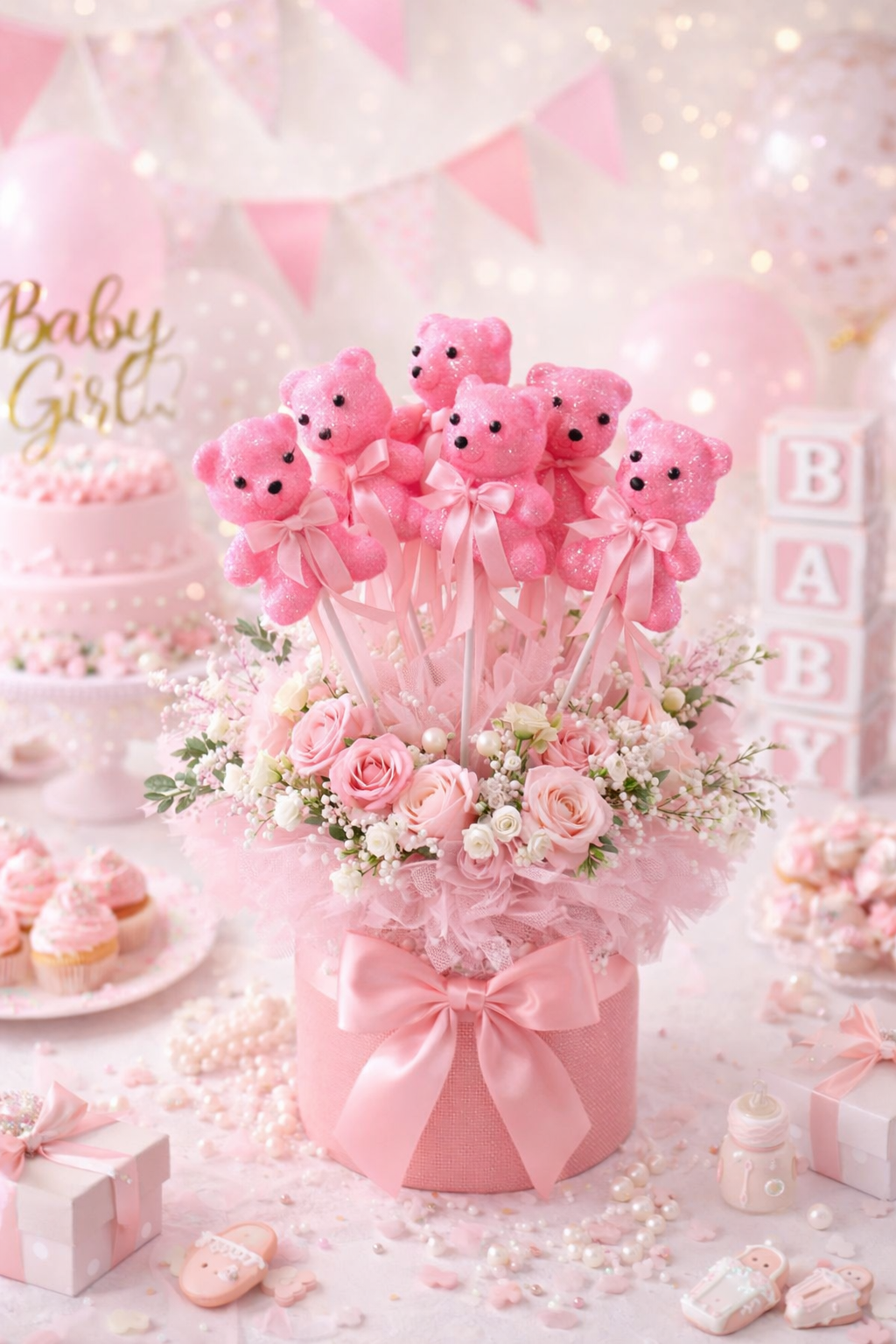 / 10’lu Pembe Simli Strafor Köpük Ayıcık Çubuklu Süs – 24 cm