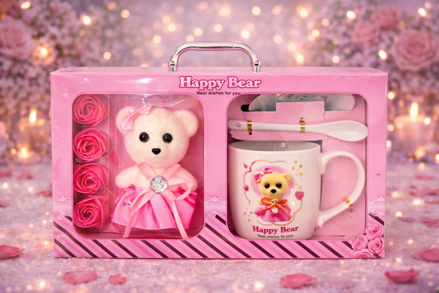 Ayıcık Figürlü Kupa, Tabak ve Dekoratif Gül Hediye Seti ENG-KB-33-Pembe